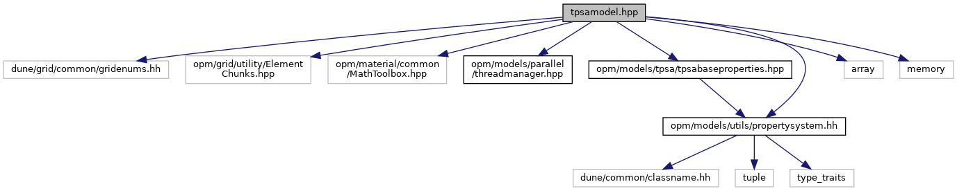 tpsamodel.hpp File Reference #include <dune/grid/common/gridenums.hh>#include <opm/grid/utility/ElementChunks.hpp>#include <opm/material/common/MathToolbox.hpp>#include <opm/models/parallel/threadmanager.hpp>#include <opm/models/tpsa/tpsabaseproperties.hpp>#include <opm/models/utils/propertysystem.hh>#include <array>#include <memory>