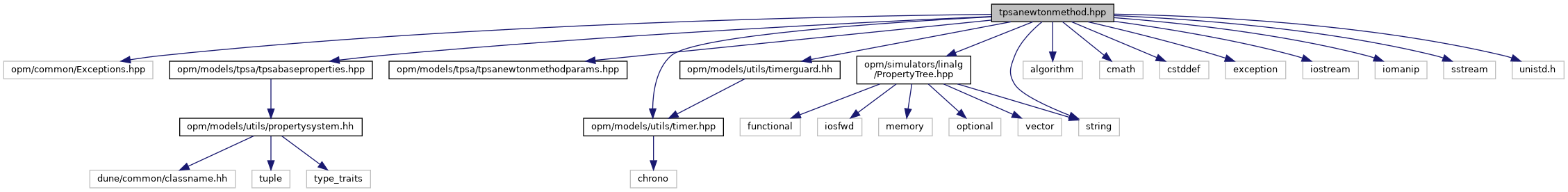 tpsanewtonmethod.hpp File Reference #include <opm/common/Exceptions.hpp>#include <opm/models/tpsa/tpsabaseproperties.hpp>#include <opm/models/tpsa/tpsanewtonmethodparams.hpp>#include <opm/models/utils/timer.hpp>#include <opm/models/utils/timerguard.hh>#include <opm/simulators/linalg/PropertyTree.hpp>#include <algorithm>#include <cmath>#include <cstddef>#include <exception>#include <iostream>#include <iomanip>#include <sstream>#include <string>#include <unistd.h>