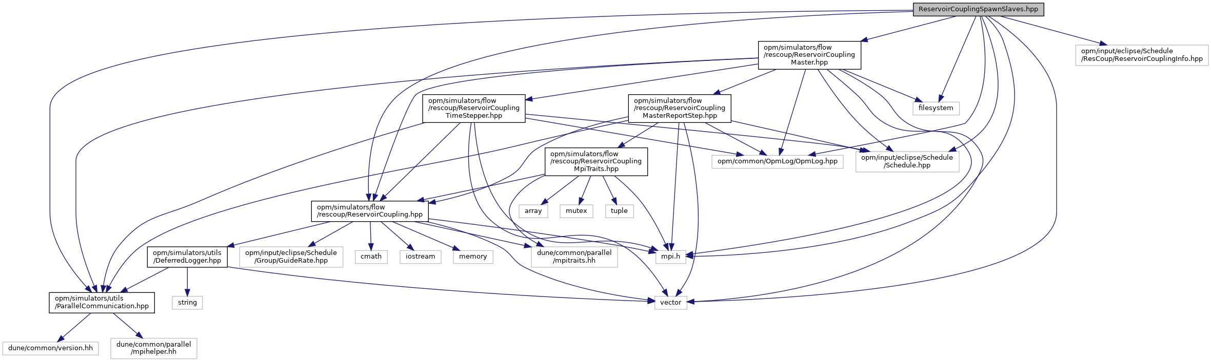 ReservoirCouplingSpawnSlaves.hpp File Reference #include <opm/simulators/utils/ParallelCommunication.hpp>#include <opm/simulators/flow/rescoup/ReservoirCoupling.hpp>#include <opm/simulators/flow/rescoup/ReservoirCouplingMaster.hpp>#include <opm/input/eclipse/Schedule/ResCoup/ReservoirCouplingInfo.hpp>#include <opm/input/eclipse/Schedule/Schedule.hpp>#include <opm/common/OpmLog/OpmLog.hpp>#include <mpi.h>#include <filesystem>#include <vector>
