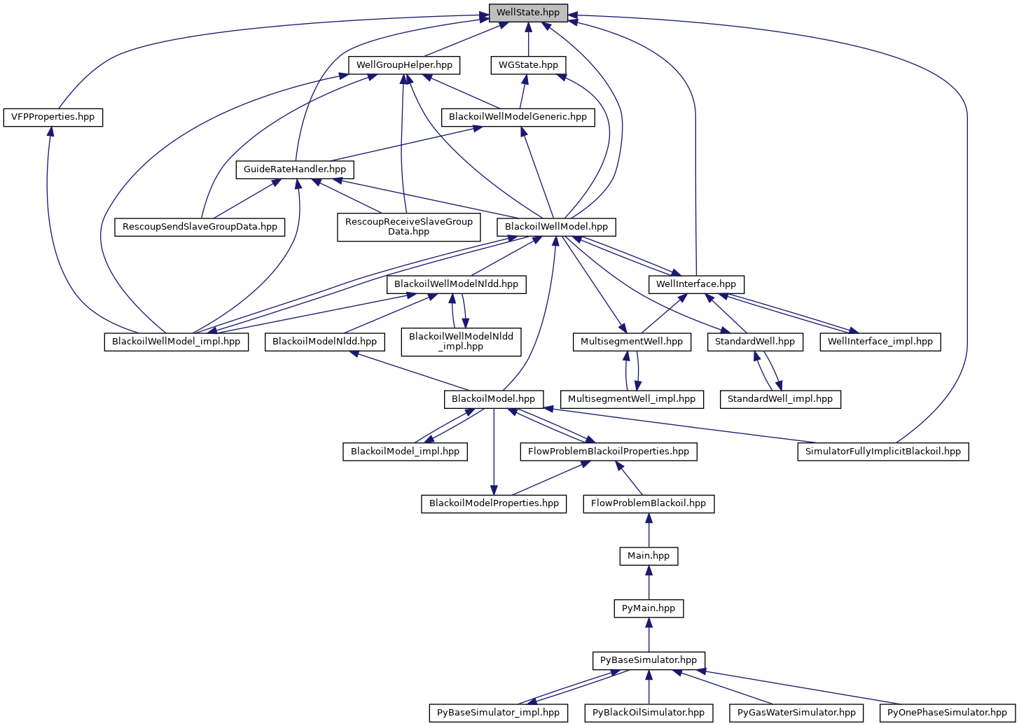 WellState.hpp File Reference #include <dune/common/version.hh>#include <dune/common/parallel/mpihelper.hh>#include <opm/common/ErrorMacros.hpp>#include <opm/material/fluidsystems/PhaseUsageInfo.hpp>#include <opm/input/eclipse/Schedule/Events.hpp>#include <opm/output/data/Wells.hpp>#include <opm/simulators/wells/GlobalWellInfo.hpp>#include <opm/simulators/wells/PerfData.hpp>#include <opm/simulators/wells/SegmentState.hpp>#include <opm/simulators/wells/SingleWellState.hpp>#include <opm/simulators/wells/WellContainer.hpp>#include <opm/simulators/utils/ParallelCommunication.hpp>#include <algorithm>#include <cstddef>#include <cstdint>#include <functional>#include <map>#include <optional>#include <string>#include <utility>#include <vector>