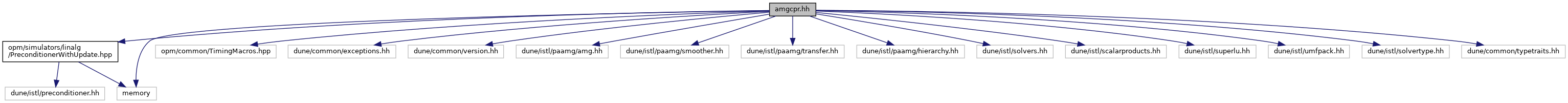 amgcpr.hh File Reference The AMG preconditioner. More... #include <opm/simulators/linalg/PreconditionerWithUpdate.hpp>#include <opm/common/TimingMacros.hpp>#include <dune/common/exceptions.hh>#include <dune/common/version.hh>#include <dune/istl/paamg/amg.hh>#include <dune/istl/paamg/smoother.hh>#include <dune/istl/paamg/transfer.hh>#include <dune/istl/paamg/hierarchy.hh>#include <dune/istl/solvers.hh>#include <dune/istl/scalarproducts.hh>#include <dune/istl/superlu.hh>#include <dune/istl/umfpack.hh>#include <dune/istl/solvertype.hh>#include <dune/common/typetraits.hh>#include <memory>