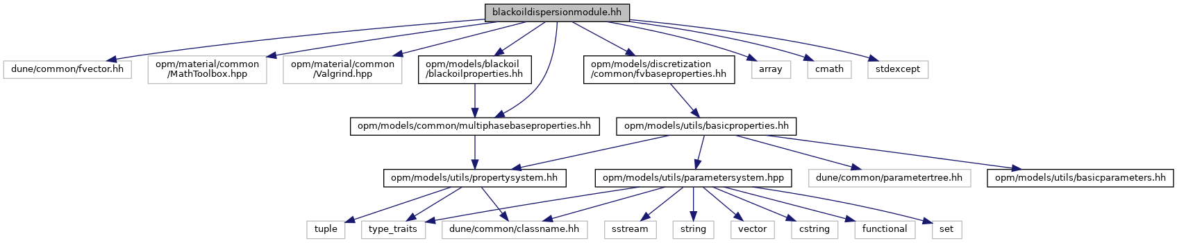 blackoildispersionmodule.hh File Reference Classes required for mechanical dispersion. More... #include <dune/common/fvector.hh>#include <opm/material/common/MathToolbox.hpp>#include <opm/material/common/Valgrind.hpp>#include <opm/models/blackoil/blackoilproperties.hh>#include <opm/models/common/multiphasebaseproperties.hh>#include <opm/models/discretization/common/fvbaseproperties.hh>#include <array>#include <cmath>#include <stdexcept>