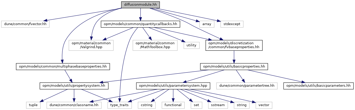 diffusionmodule.hh File Reference Classes required for molecular diffusion. More... #include <dune/common/fvector.hh>#include <opm/material/common/Valgrind.hpp>#include <opm/models/common/multiphasebaseproperties.hh>#include <opm/models/common/quantitycallbacks.hh>#include <opm/models/discretization/common/fvbaseproperties.hh>#include <array>#include <stdexcept>