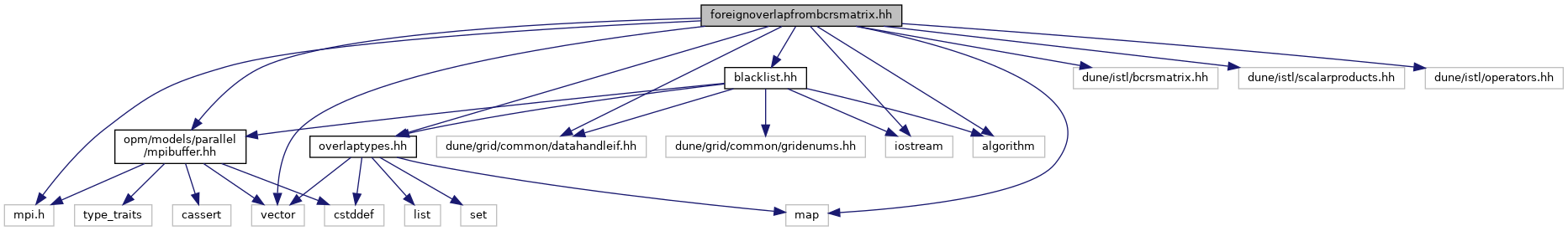 foreignoverlapfrombcrsmatrix.hh File Reference #include "overlaptypes.hh"#include "blacklist.hh"#include <opm/models/parallel/mpibuffer.hh>#include <dune/grid/common/datahandleif.hh>#include <dune/istl/bcrsmatrix.hh>#include <dune/istl/scalarproducts.hh>#include <dune/istl/operators.hh>#include <algorithm>#include <iostream>#include <map>#include <vector>#include <mpi.h>