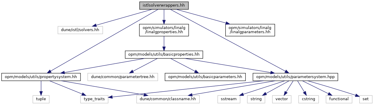 istlsolverwrappers.hh File Reference Provides wrapper classes for the iterative linear solvers available in dune-istl. More... #include <dune/istl/solvers.hh>#include <opm/models/utils/propertysystem.hh>#include <opm/models/utils/parametersystem.hpp>#include <opm/simulators/linalg/linalgparameters.hh>#include <opm/simulators/linalg/linalgproperties.hh>