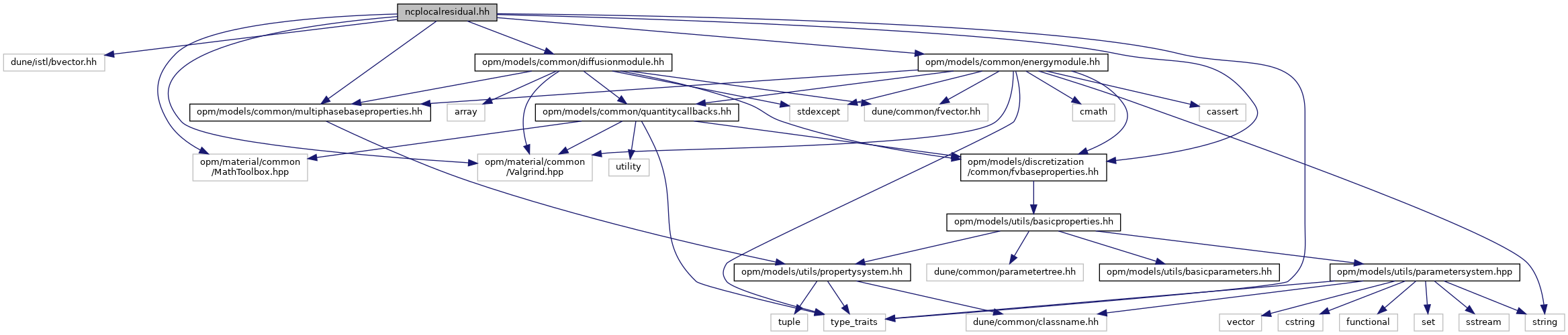 ncplocalresidual.hh File Reference #include <dune/istl/bvector.hh>#include <opm/material/common/MathToolbox.hpp>#include <opm/material/common/Valgrind.hpp>#include <opm/models/common/diffusionmodule.hh>#include <opm/models/common/energymodule.hh>#include <opm/models/common/multiphasebaseproperties.hh>#include <opm/models/discretization/common/fvbaseproperties.hh>#include <type_traits>