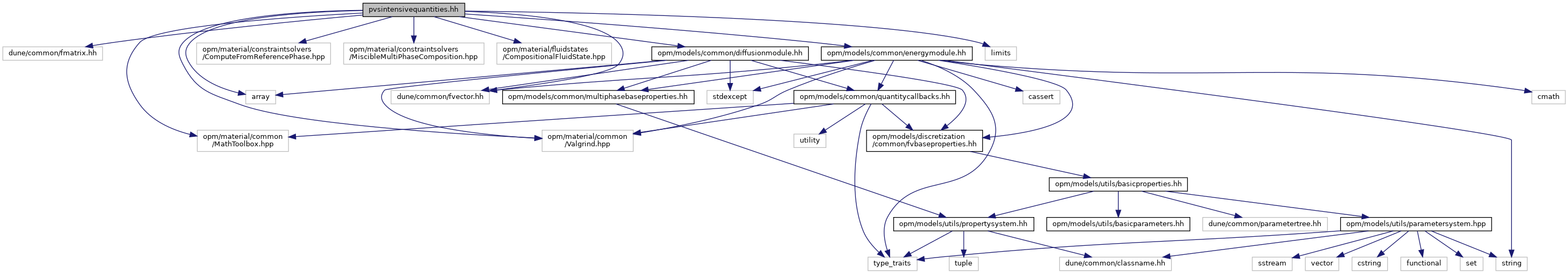 pvsintensivequantities.hh File Reference #include <dune/common/fmatrix.hh>#include <dune/common/fvector.hh>#include <opm/material/common/MathToolbox.hpp>#include <opm/material/common/Valgrind.hpp>#include <opm/material/constraintsolvers/ComputeFromReferencePhase.hpp>#include <opm/material/constraintsolvers/MiscibleMultiPhaseComposition.hpp>#include <opm/material/fluidstates/CompositionalFluidState.hpp>#include <opm/models/common/diffusionmodule.hh>#include <opm/models/common/energymodule.hh>#include <array>#include <limits>