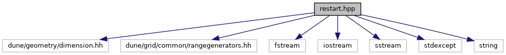 restart.hpp File Reference #include <dune/geometry/dimension.hh>#include <dune/grid/common/rangegenerators.hh>#include <fstream>#include <iostream>#include <sstream>#include <stdexcept>#include <string>