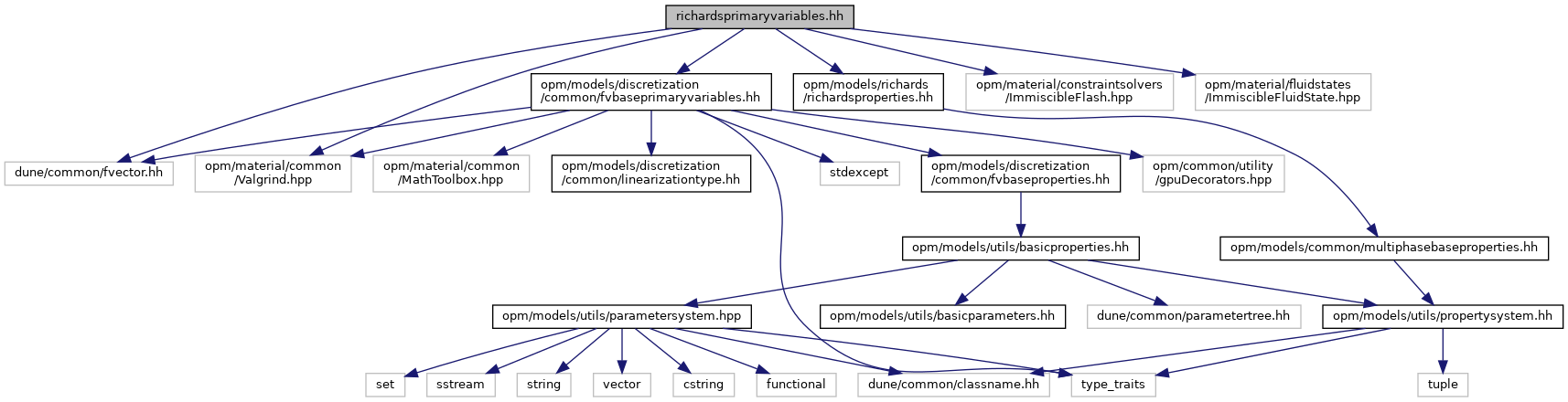 richardsprimaryvariables.hh File Reference #include <dune/common/fvector.hh>#include <opm/material/common/Valgrind.hpp>#include <opm/material/constraintsolvers/ImmiscibleFlash.hpp>#include <opm/material/fluidstates/ImmiscibleFluidState.hpp>#include <opm/models/richards/richardsproperties.hh>#include <opm/models/discretization/common/fvbaseprimaryvariables.hh>