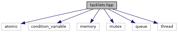 tasklets.hpp File Reference Provides a mechanism to dispatch work to separate threads. More... #include <atomic>#include <condition_variable>#include <memory>#include <mutex>#include <queue>#include <thread>